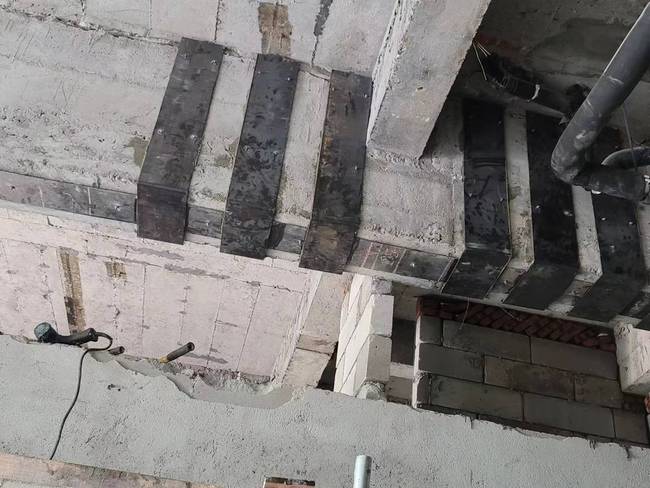 在准备好的加固部位涂抹粘结材料,将粘钢板嵌入粘结材料中,使其与原结构牢固粘合。